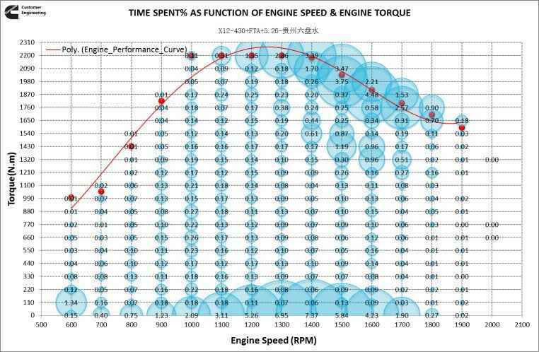 从Duty cycle分布看,车辆工况较恶劣,多运行在满负荷区域,相比之下福康X12发动机在外特性运行占比稍少,得益于X12-430发动机比其他品牌动力扭矩更大,具备更优的道路坡度适应性,动力性占优势。