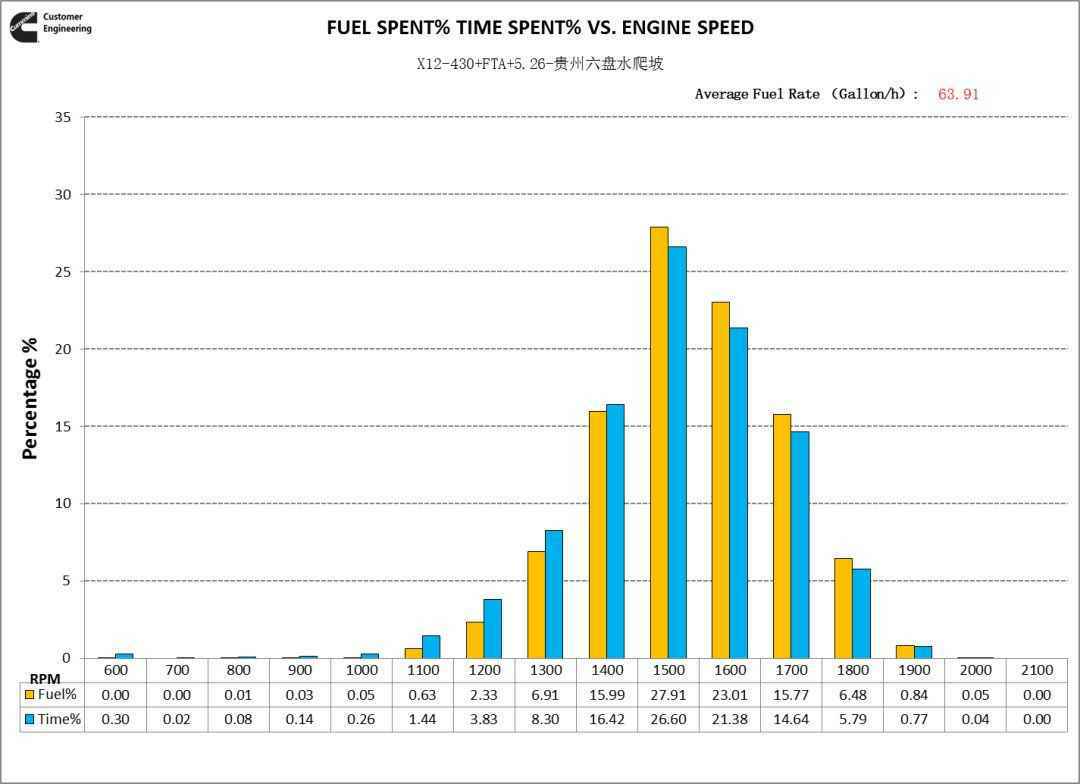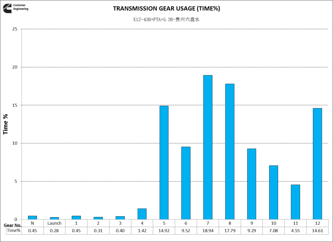 从爬坡工况转速分布看,福康X12动力转速重心在1500rpm,其他品牌动力转速重心在1600~1700rpm,福康X12动力使用转速更低。这就是福康低转速大扭矩的特性,可以让司机选择高一个挡位运行,降低了发动机转速,当然好处就是不仅满足动力性需求,还节油。