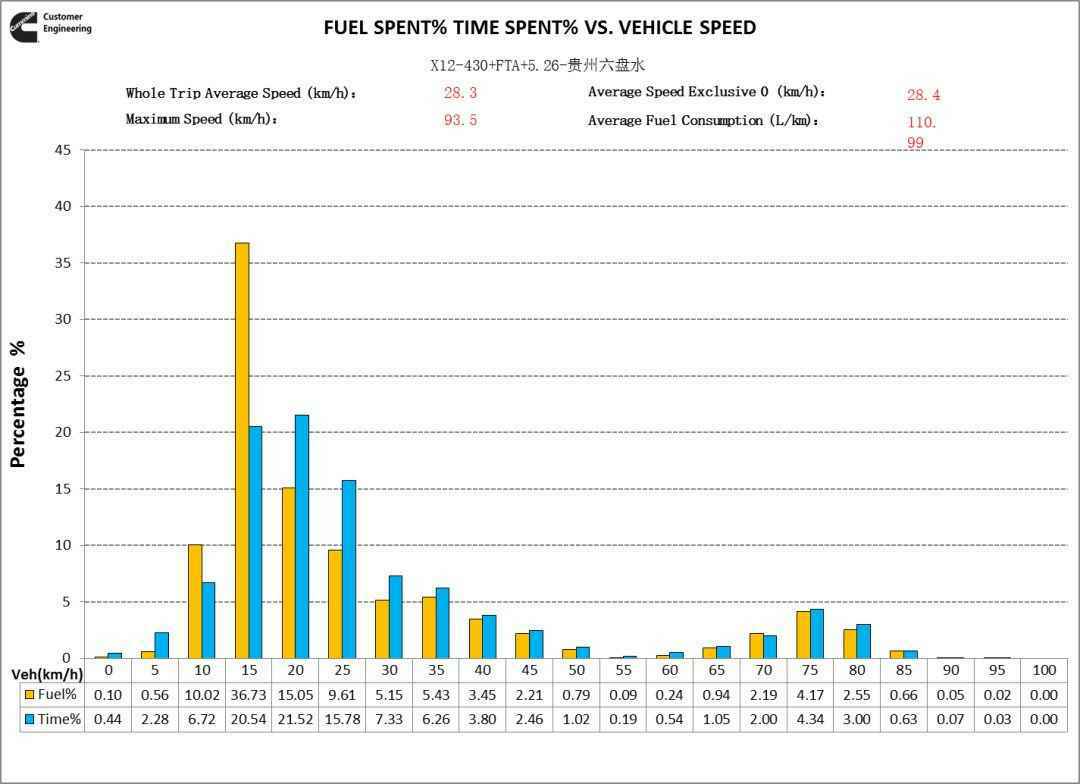 从车速分布看,在重载低速段,配装福康X12动力的欧曼自卸车辆的车速高于其他车辆,说明在重载工况,福康X12动力性优于其他品牌动力。这个数据结果与广大用户反馈相符。