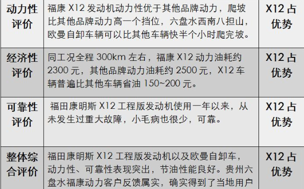 综合全程油耗结果看,X12车辆的经济性优于其他品牌动力约13%,与用户描述福康X12的欧曼自卸车普遍比其他车辆油耗省约10%相符。