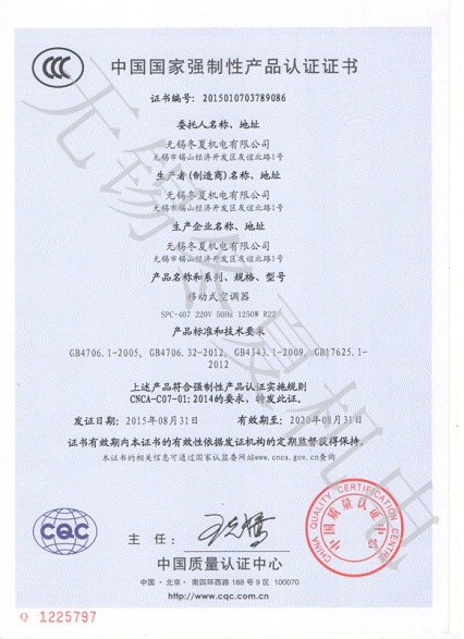 近日,星空官方web站-星空(中国)的移动工业冷气机、暖风机产品7个型号取得了中国质量认证中心颁发的3C强制认证证书。