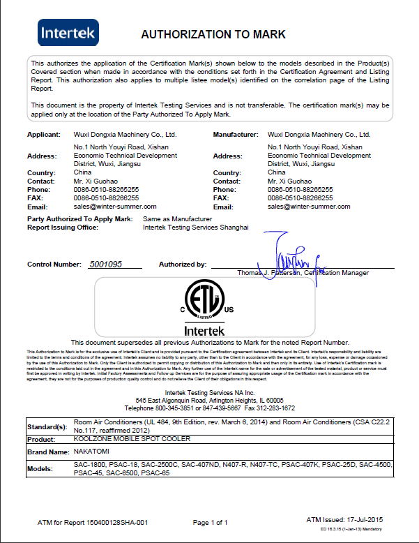 星空官方web站-星空(中国)近日宣布公司移动式工业冷气机获得的质量与安全第三方机构天祥实验室(世界上规模的消费品测试、检验和认证公司之一)颁发的ETL认证。